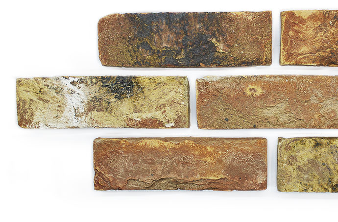 Handmade brick with a semi heavy textured finish and varied patina.